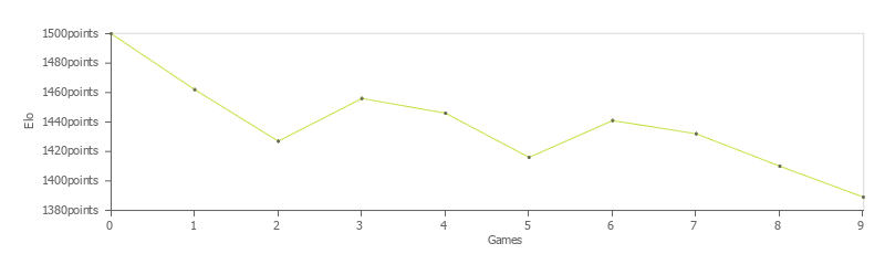 Different opponents: 5 || Average games/opponent: 1.8 || Total inflation: -46 || Games vs overrated: 44% || Games vs underrated: 56%